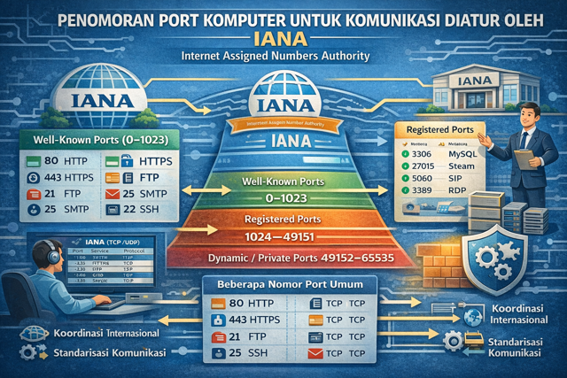 Dalam dunia jaringan komputer dan internet, komunikasi antar perangkat tidak hanya bergantung pada alamat IP, tetapi juga pada nomor port. Nomor port berfungsi sebagai penanda jalur komunikasi yang memungkinkan berbagai aplikasi dan layanan berjalan secara bersamaan pada satu perangkat. Tanpa sistem penomoran port yang teratur, pertukaran data di jaringan akan menjadi kacau dan sulit dikendalikan. Oleh karena itu, penomoran port komputer untuk komunikasi diatur oleh organisasi internasional bernama IANA (Internet Assigned Numbers Authority).